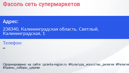 Фасоль, сеть супермаркетов по адресу 238340, Калининградская область, Светлый, Калининградская, 1 в дальнейшем Организация, размещена в следующих категориях: