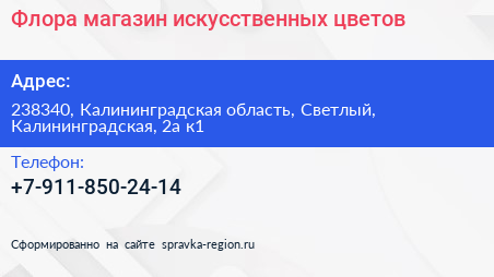 Флора, магазин искусственных цветов по адресу 238340, Калининградская область, Светлый, Калининградская, 2а к1 в дальнейшем Организация, размещена в следующих категориях: