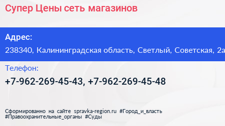 Супер Цены, сеть магазинов по адресу 238340, Калининградская область, Светлый, Советская, 2а в дальнейшем Организация, размещена в следующих категориях: