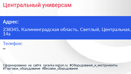 Центральный, универсам по адресу 238345, Калининградская область, Светлый, Центральная, 14а в дальнейшем Организация, размещена в следующих категориях: