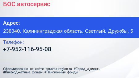 БОС, автосервис по адресу 238340, Калининградская область, Светлый, Дружбы, 5 в дальнейшем Организация, размещена в следующих категориях:
