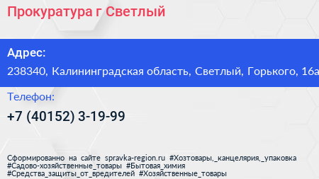 Прокуратура, г. Светлый по адресу 238340, Калининградская область, Светлый, Горького, 16а в дальнейшем Организация, размещена в следующих категориях: