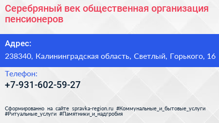 Серебряный век, общественная организация пенсионеров по адресу 238340, Калининградская область, Светлый, Горького, 16 в дальнейшем Организация, размещена в следующих категориях: