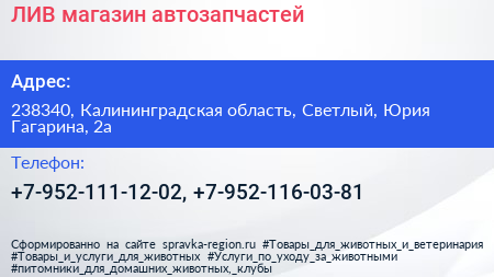 ЛИВ, магазин автозапчастей по адресу 238340, Калининградская область, Светлый, Юрия Гагарина, 2а в дальнейшем Организация, размещена в следующих категориях: