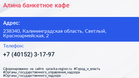 Алина, банкетное кафе по адресу 238340, Калининградская область, Светлый, Красноармейская, 2 в дальнейшем Организация, размещена в следующих категориях: