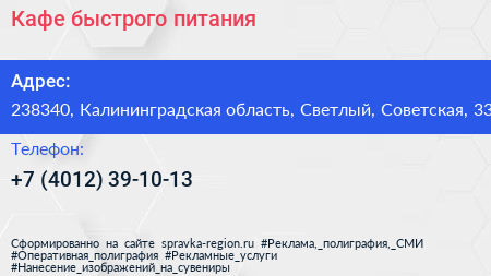 Кафе быстрого питания по адресу 238340, Калининградская область, Светлый, Советская, 33 в дальнейшем Организация, размещена в следующих категориях: