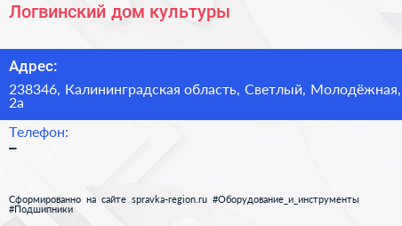 Логвинский дом культуры по адресу 238346, Калининградская область, Светлый, Молодёжная, 2а в дальнейшем Организация, размещена в следующих категориях: