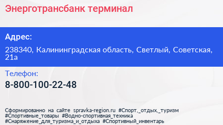 Энерготрансбанк, терминал по адресу 238340, Калининградская область, Светлый, Советская, 21а в дальнейшем Организация, размещена в следующих категориях: