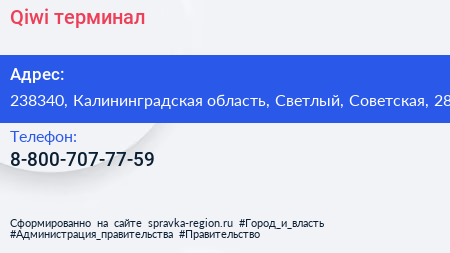 Qiwi, терминал по адресу 238340, Калининградская область, Светлый, Советская, 28 в дальнейшем Организация, размещена в следующих категориях: