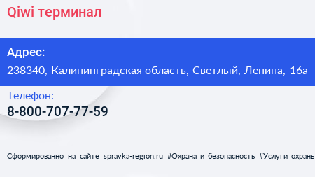 Qiwi, терминал по адресу 238340, Калининградская область, Светлый, Ленина, 16а в дальнейшем Организация, размещена в следующих категориях: