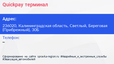 Quickpay, терминал по адресу 236020, Калининградская область, Светлый, Береговая (Прибрежный), 30Б в дальнейшем Организация, размещена в следующих категориях: