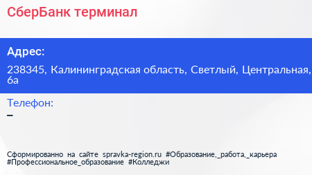 СберБанк, терминал по адресу 238345, Калининградская область, Светлый, Центральная, 6а в дальнейшем Организация, размещена в следующих категориях: