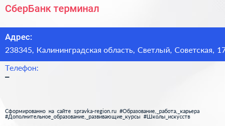 СберБанк, терминал по адресу 238345, Калининградская область, Светлый, Советская, 17 в дальнейшем Организация, размещена в следующих категориях: