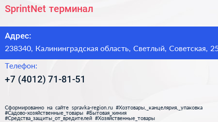 SprintNet, терминал по адресу 238340, Калининградская область, Светлый, Советская, 25 в дальнейшем Организация, размещена в следующих категориях: