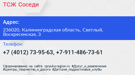 ТСЖ Соседи по адресу 236020, Калининградская область, Светлый, Воскресенская, 3 в дальнейшем Организация, размещена в следующих категориях: