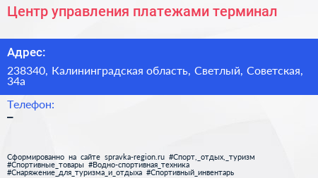 Центр управления платежами, терминал по адресу 238340, Калининградская область, Светлый, Советская, 34а в дальнейшем Организация, размещена в следующих категориях:
