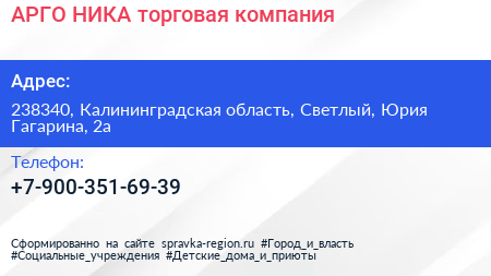 АРГО-НИКА, торговая компания по адресу 238340, Калининградская область, Светлый, Юрия Гагарина, 2а в дальнейшем Организация, размещена в следующих категориях: