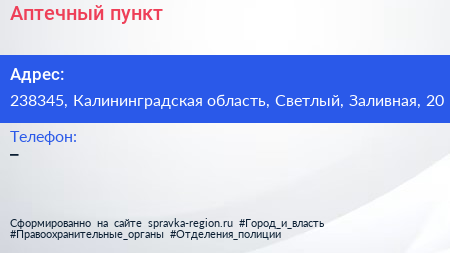 Аптечный пункт по адресу 238345, Калининградская область, Светлый, Заливная, 20 в дальнейшем Организация, размещена в следующих категориях: