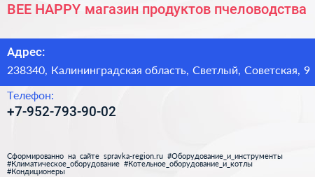 BEE HAPPY, магазин продуктов пчеловодства по адресу 238340, Калининградская область, Светлый, Советская, 9 в дальнейшем Организация, размещена в следующих категориях: