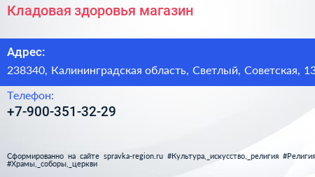 Кладовая здоровья, магазин по адресу 238340, Калининградская область, Светлый, Советская, 13 в дальнейшем Организация, размещена в следующих категориях: