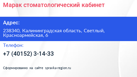 Марак, стоматологический кабинет по адресу 238340, Калининградская область, Светлый, Красноармейская, 6 в дальнейшем Организация, размещена в следующих категориях: