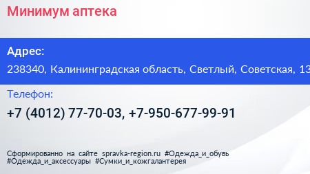 Минимум, аптека по адресу 238340, Калининградская область, Светлый, Советская, 13 в дальнейшем Организация, размещена в следующих категориях: