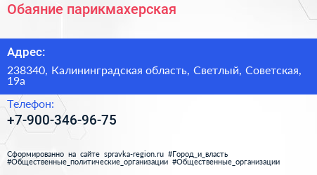 Обаяние, парикмахерская по адресу 238340, Калининградская область, Светлый, Советская, 19а в дальнейшем Организация, размещена в следующих категориях: