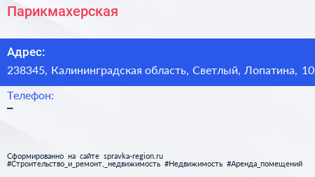 Парикмахерская по адресу 238345, Калининградская область, Светлый, Лопатина, 10 в дальнейшем Организация, размещена в следующих категориях: