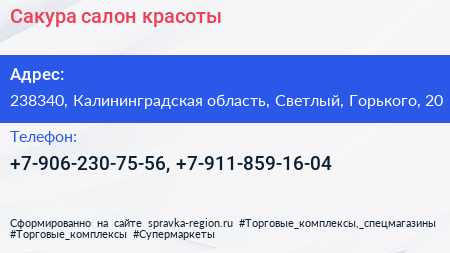 Сакура, салон красоты по адресу 238340, Калининградская область, Светлый, Горького, 20 в дальнейшем Организация, размещена в следующих категориях: