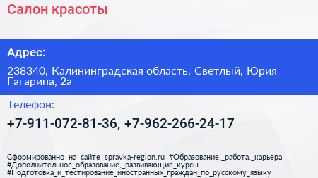 Салон красоты по адресу 238340, Калининградская область, Светлый, Юрия Гагарина, 2а в дальнейшем Организация, размещена в следующих категориях: