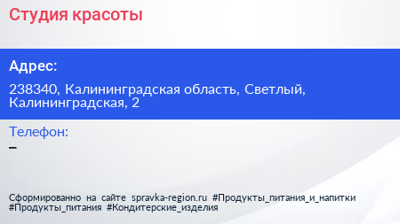 Студия красоты по адресу 238340, Калининградская область, Светлый, Калининградская, 2 в дальнейшем Организация, размещена в следующих категориях: