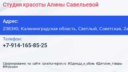 Студия красоты Алины Савельевой по адресу 238340, Калининградская область, Светлый, Советская, 2а в дальнейшем Организация, размещена в следующих категориях: