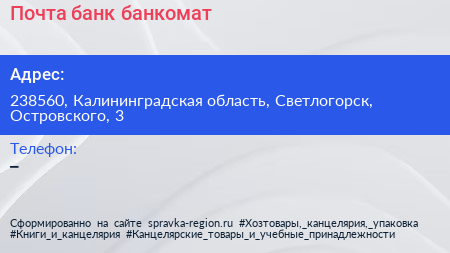 Почта банк, банкомат по адресу 238560, Калининградская область, Светлогорск, Островского, 3 в дальнейшем Организация, размещена в следующих категориях: