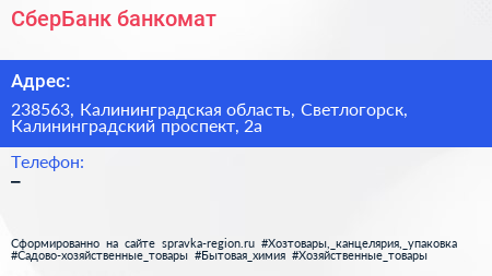СберБанк, банкомат по адресу 238563, Калининградская область, Светлогорск, Калининградский проспект, 2а в дальнейшем Организация, размещена в следующих категориях: