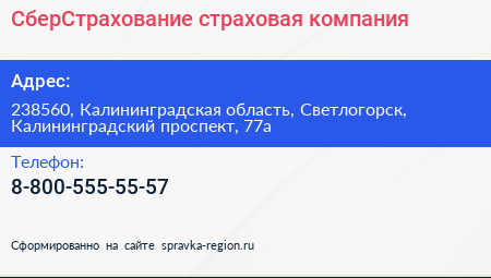 СберСтрахование, страховая компания по адресу 238560, Калининградская область, Светлогорск, Калининградский проспект, 77а в дальнейшем Организация, размещена в следующих категориях: