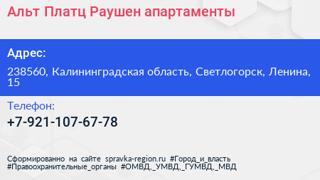Альт Платц Раушен, апартаменты по адресу 238560, Калининградская область, Светлогорск, Ленина, 15 в дальнейшем Организация, размещена в следующих категориях: