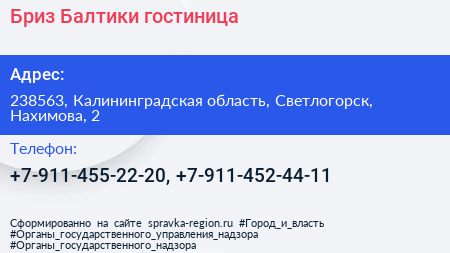 Бриз Балтики, гостиница по адресу 238563, Калининградская область, Светлогорск, Нахимова, 2 в дальнейшем Организация, размещена в следующих категориях: