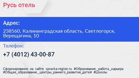 Русь, отель по адресу 238560, Калининградская область, Светлогорск, Верещагина, 10 в дальнейшем Организация, размещена в следующих категориях: