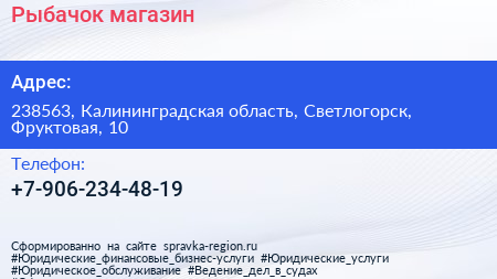 Рыбачок, магазин по адресу 238563, Калининградская область, Светлогорск, Фруктовая, 10 в дальнейшем Организация, размещена в следующих категориях: