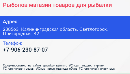 Рыболов, магазин товаров для рыбалки по адресу 238563, Калининградская область, Светлогорск, Пригородная, 42 в дальнейшем Организация, размещена в следующих категориях: