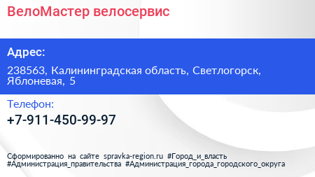ВелоМастер, велосервис по адресу 238563, Калининградская область, Светлогорск, Яблоневая, 5 в дальнейшем Организация, размещена в следующих категориях: