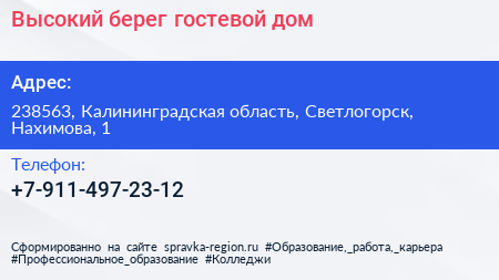 Высокий берег, гостевой дом по адресу 238563, Калининградская область, Светлогорск, Нахимова, 1 в дальнейшем Организация, размещена в следующих категориях: