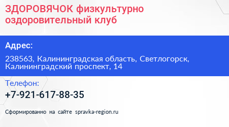 ЗДОРОВЯЧОК, физкультурно-оздоровительный клуб по адресу 238563, Калининградская область, Светлогорск, Калининградский проспект, 14 в дальнейшем Организация, размещена в следующих категориях:
