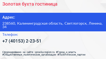 Золотая бухта, гостиница по адресу 238560, Калининградская область, Светлогорск, Ленина, 34 в дальнейшем Организация, размещена в следующих категориях: