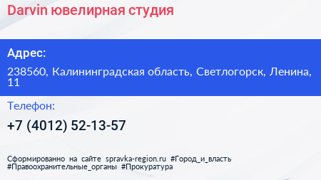 Darvin, ювелирная студия по адресу 238560, Калининградская область, Светлогорск, Ленина, 11 в дальнейшем Организация, размещена в следующих категориях: