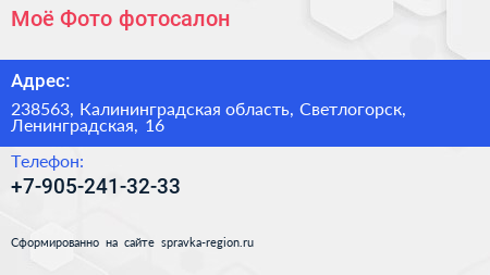 Моё Фото, фотосалон по адресу 238563, Калининградская область, Светлогорск, Ленинградская, 16 в дальнейшем Организация, размещена в следующих категориях: