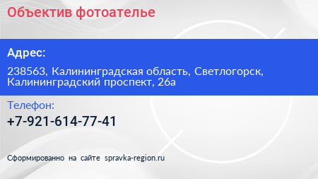 Объектив, фотоателье по адресу 238563, Калининградская область, Светлогорск, Калининградский проспект, 26а в дальнейшем Организация, размещена в следующих категориях: