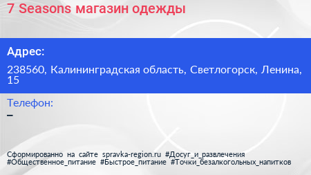 7 Seasons, магазин одежды по адресу 238560, Калининградская область, Светлогорск, Ленина, 15 в дальнейшем Организация, размещена в следующих категориях: