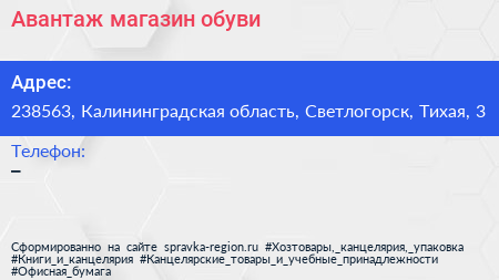 Авантаж, магазин обуви по адресу 238563, Калининградская область, Светлогорск, Тихая, 3 в дальнейшем Организация, размещена в следующих категориях: