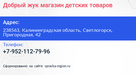 Добрый жук, магазин детских товаров по адресу 238563, Калининградская область, Светлогорск, Пригородная, 42 в дальнейшем Организация, размещена в следующих категориях: